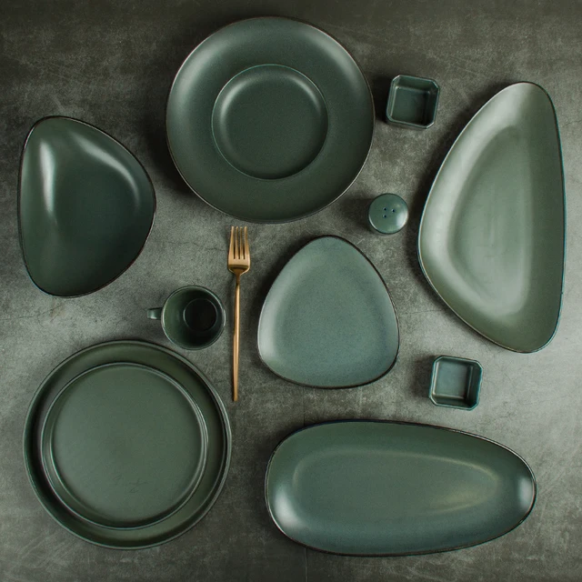 JQY Tableware Handmade Green Reactive Glaze Ceramic Dinnerware Set Dinner Plates and Bowls Vintage Porcelain Dish Set Crockery